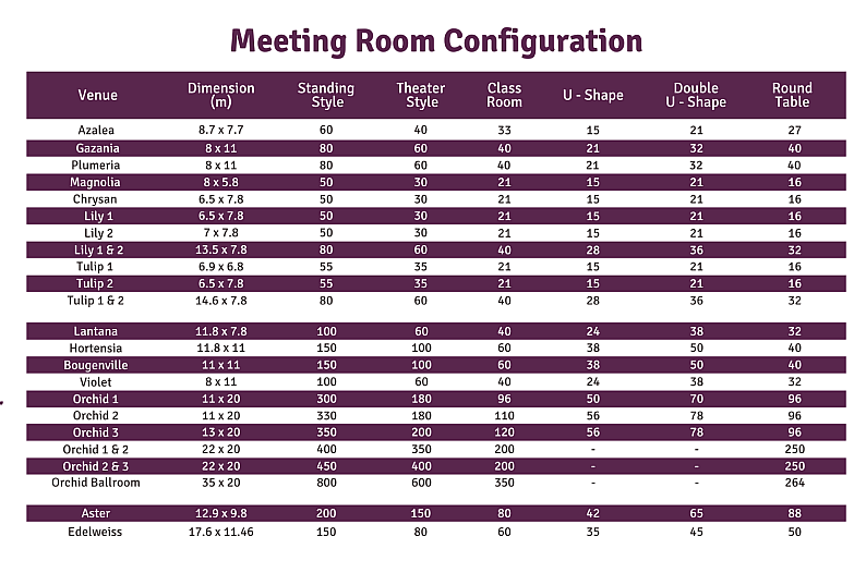 Rasakan pengalaman mengadakan acara yang luar biasa di tempat kami yang prestisius, terletak di pusat Cihampelas, Bandung. Grand Tjokro Premiere Bandung menghadirkan 18 ruang pertemuan yang dirancang dengan teliti, masing-masing disesuaikan untuk berbagai jenis pertemuan, mulai dari konferensi perusahaan hingga diskusi pribadi. Ballroom kami yang luas dapat menampung hingga 800 tamu, menjadikannya pilihan sempurna untuk acara besar maupun acara istimewa. Dikenal di seluruh Bandung dengan fasilitas kelas atas dan layanan yang tak tertandingi, kami berkomitmen untuk menjadikan setiap pertemuan sebagai pengalaman yang tak terlupakan.