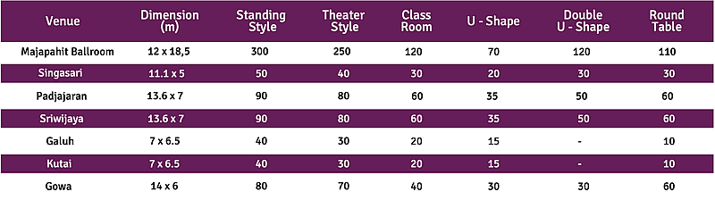 Di Grand Tjokro Jakarta, kami memahami pentingnya acara yang terorganisir dengan baik. Fasilitas kami dilengkapi dengan fasilitas yang lengkap untuk memastikan pengalaman yang sempurna. Apakah Anda mengadakan pertemuan berskala besar di ballroom kami yang megah atau pertemuan yang lebih kecil di salah satu ruangan kami yang serbaguna, Anda dapat mengharapkan layanan terbaik dan perhatian yang teliti pada setiap detail.